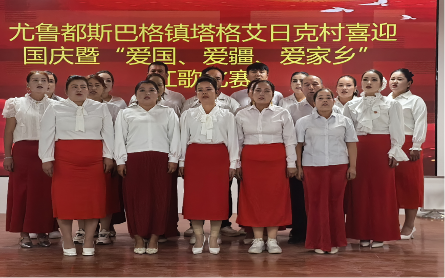 为热烈庆祝国庆节,讴歌中华民族实现伟大复兴的百年奋斗历程,颂扬中国共产党的丰功伟绩,唱响共产党好、社会主义好、改革开放好、伟大祖国好的主旋律,阿克苏地区教育局驻尤鲁都斯巴格镇塔格艾日克村工作队与村委会共同举办了喜迎国庆暨“爱国、爱疆、爱家乡”爱国主义歌曲比赛活动。
