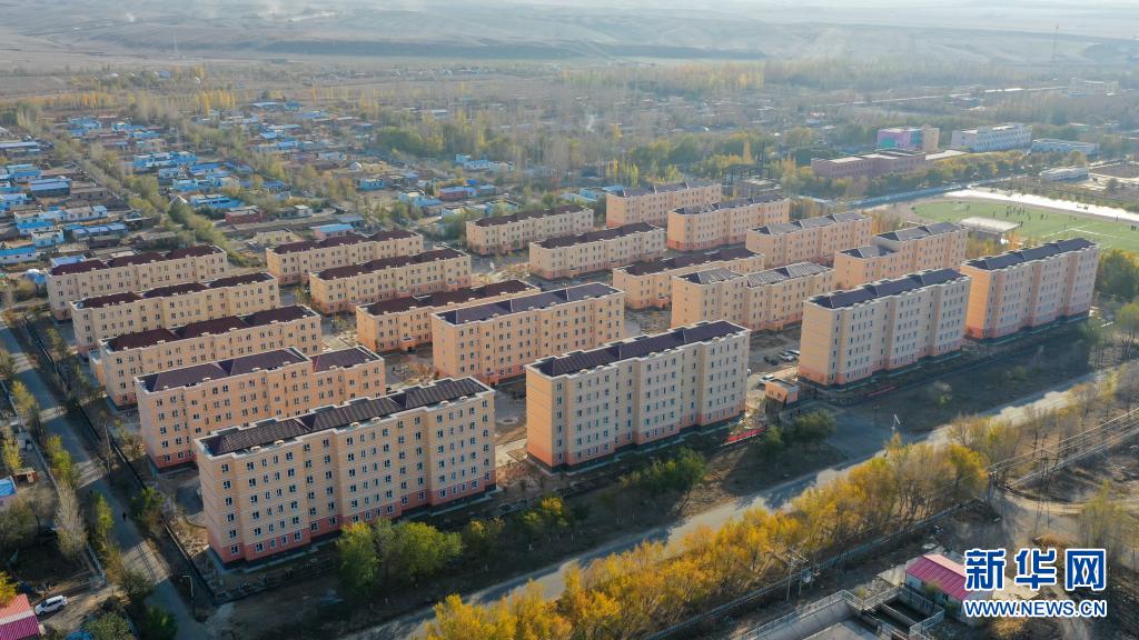 这是2020年10月16日拍摄的新疆昌吉市阿什里乡天鹅小镇(无人机照片)。由福建援疆泉州分指挥部支援建设的天鹅小镇是牧民定居项目,数百户牧民结束游牧生活,住进天鹅小镇实现定居。新华社记者 丁磊 摄