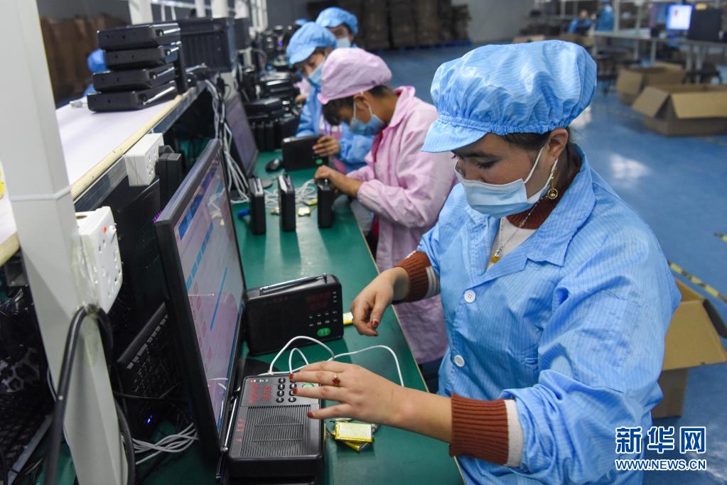 在位于新疆策勒县天津工业园区内的智能制造产业园,工人在流水线上忙碌(2020年11月4日摄)。 新华社记者 丁磊 摄