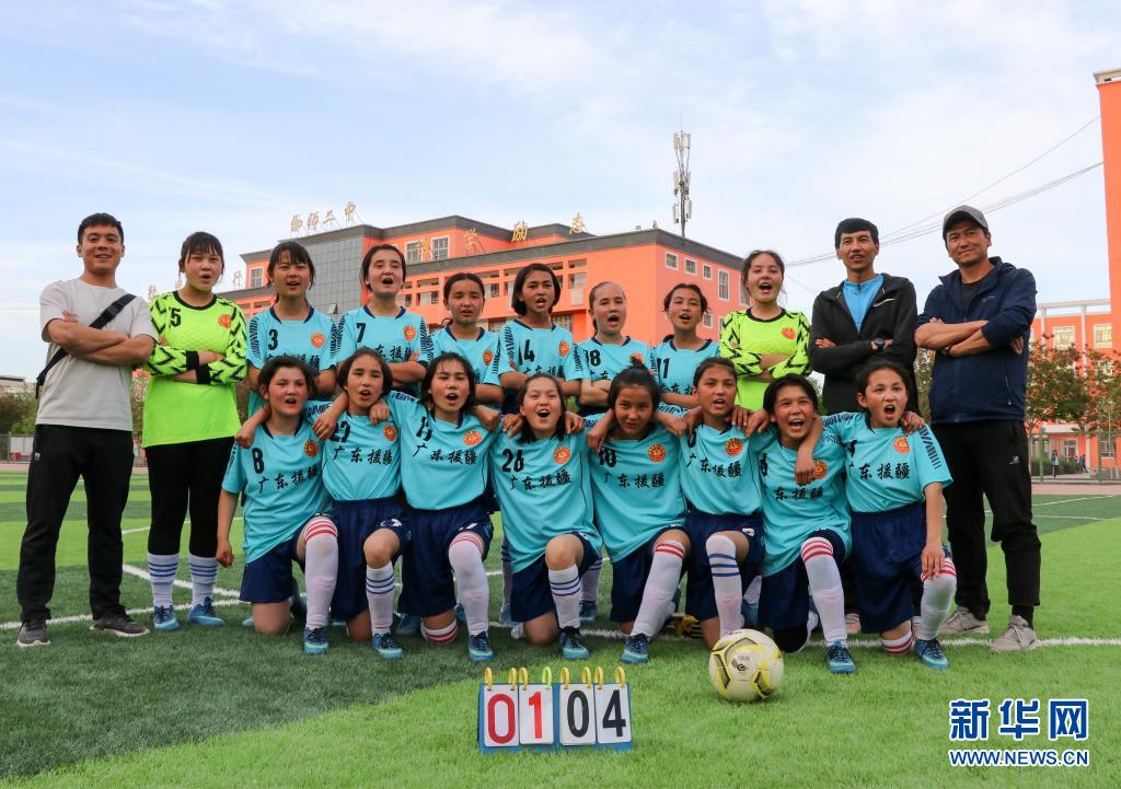 这是新疆伽师县第二中学女子足球队合影(4月24日摄)。2020年5月,广东援疆指挥部帮助伽师县第二中学组建学校第一支女子足球队,并派遣专业足球教练,捐赠全套足球装备,修建训练场,全方面提供人力物力保障。 新华社发(杨昊 摄)