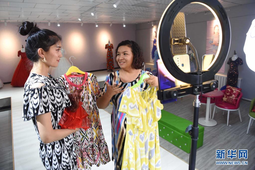 在新疆伽师县的祖美尔服装有限公司,公司负责人排丽旦·吐地(右)和员工讨论网络直播带货细节(7月11日摄)。2020年,排丽旦·吐地被广东援疆指挥部遴选为致富带头人,获得项目资金支持后,她改造展厅,增加实体店铺,并开展线上网店运营,带动150人就业。 新华社记者 丁磊 摄