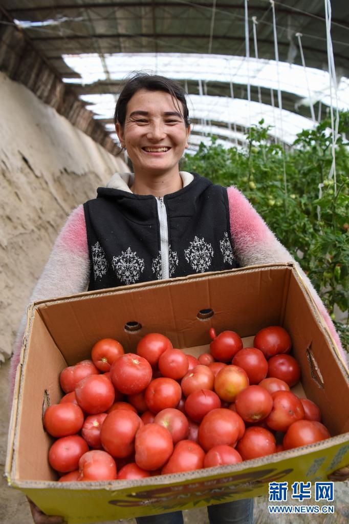 在新疆莎车县伊什库力乡设施农业基地,种植户展示采摘的西红柿(2020年3月18日摄)。上海援疆莎车分指挥部协调推动相关公司在当地建立设施农业基地,帮助农民在家门口实现就业。新华社记者 丁磊 摄