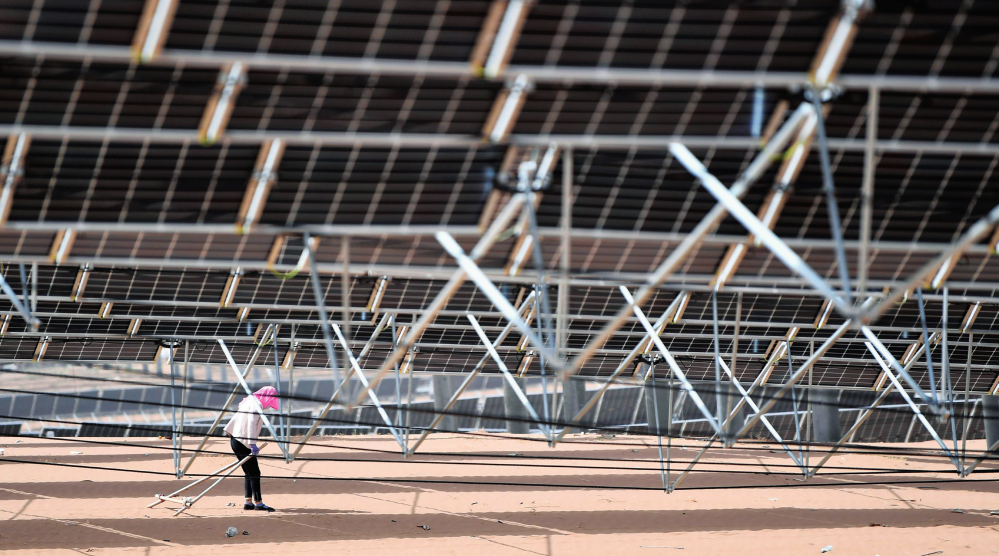 在甘肃省武威市凉州区九墩滩光伏治沙示范园区,工人在光伏板下作业(2023 年 5 月 19 日摄) 陈斌摄 / 本刊