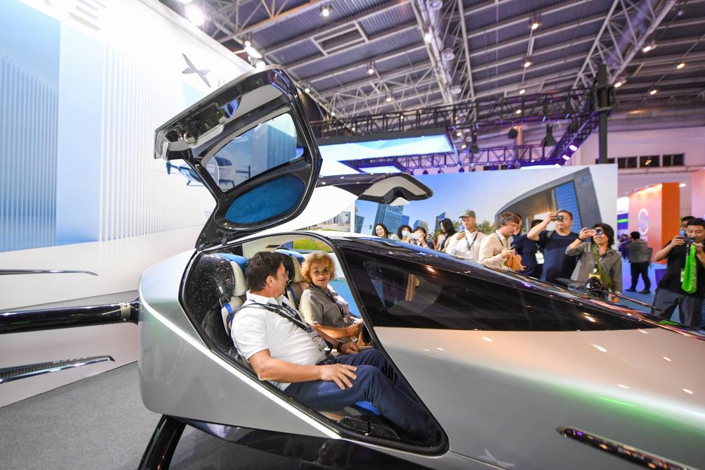 9月21日,在2023世界智能网联汽车大会室内展区,两位参观者在参观小鹏飞行汽车。新华社记者 鞠焕宗 摄