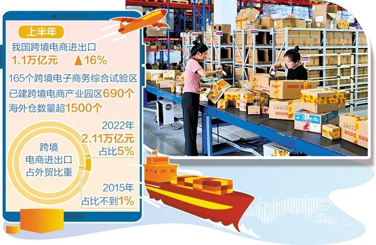 数据显示,2022年,中国跨境电商进出口达2.11万亿元,占外贸的比重由2015年的不到1%增长至5%。今年上半年,我国跨境电商进出口达1.1万亿元,同比增长16%。165个跨境电商综试区已建跨境电商产业园区690个,海外仓数量超1500个。