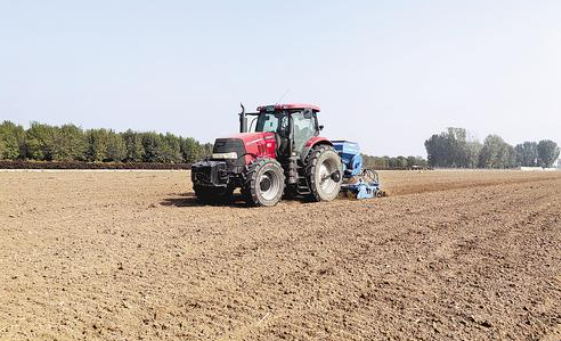 10月17日,伴随着“隆隆”机声,一台大马力拖拉机牵引着播种机在望都县望都镇的农田里来回穿梭,抢抓农时播种冬小麦。当地种粮大户许月强蹲在地里,仔细查看小麦的播种密度。