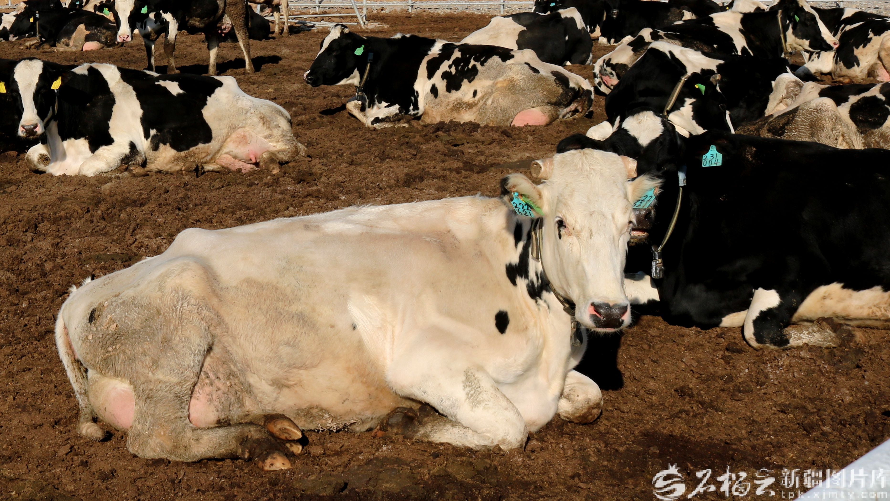 4月19日,温宿县天原牧业圈舍内,奶牛佩戴电子耳标等智能设备,状态清晰可见。