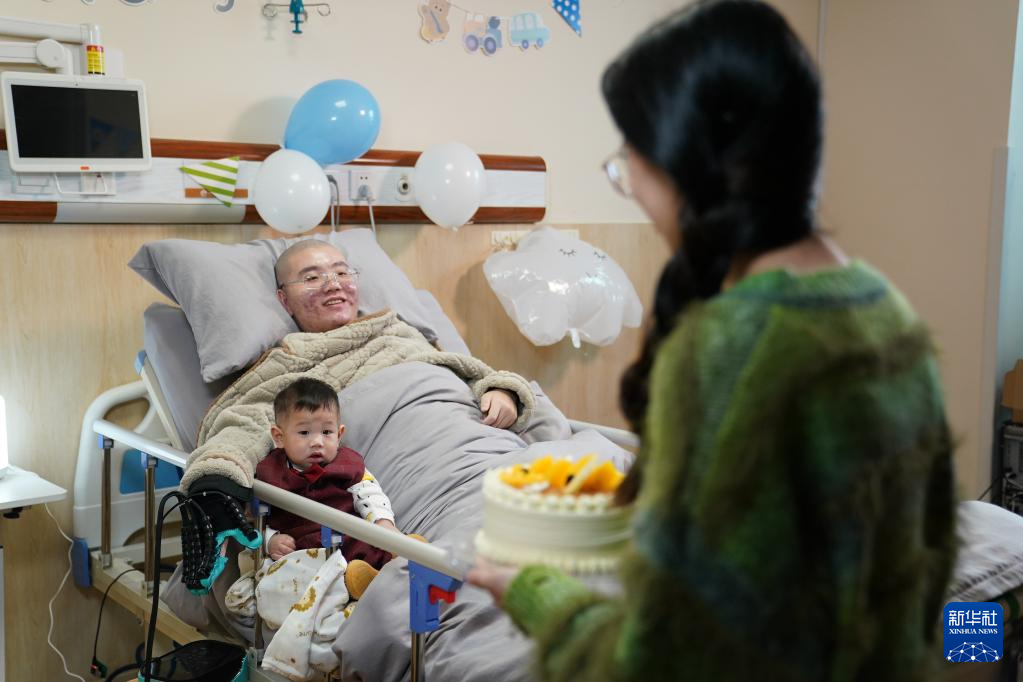 3月28日,邓先生通过脑机接口控制外骨骼给蛋糕插上蜡烛。新华社记者 周密 摄