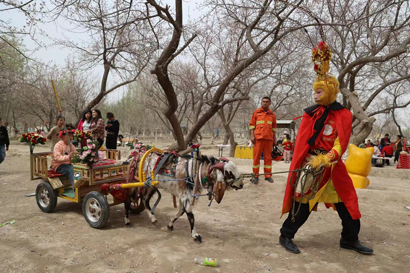 乌什镇喀赞村村民萨拉木·图尔荪的羊车前排满了游客,他借助旅游热度取巧化身“孙悟空”,边表演边用羊车载客,吸引不少游客前来“凑热闹”。尽管忙到“起飞”,但萨拉木的脸上满是笑意。