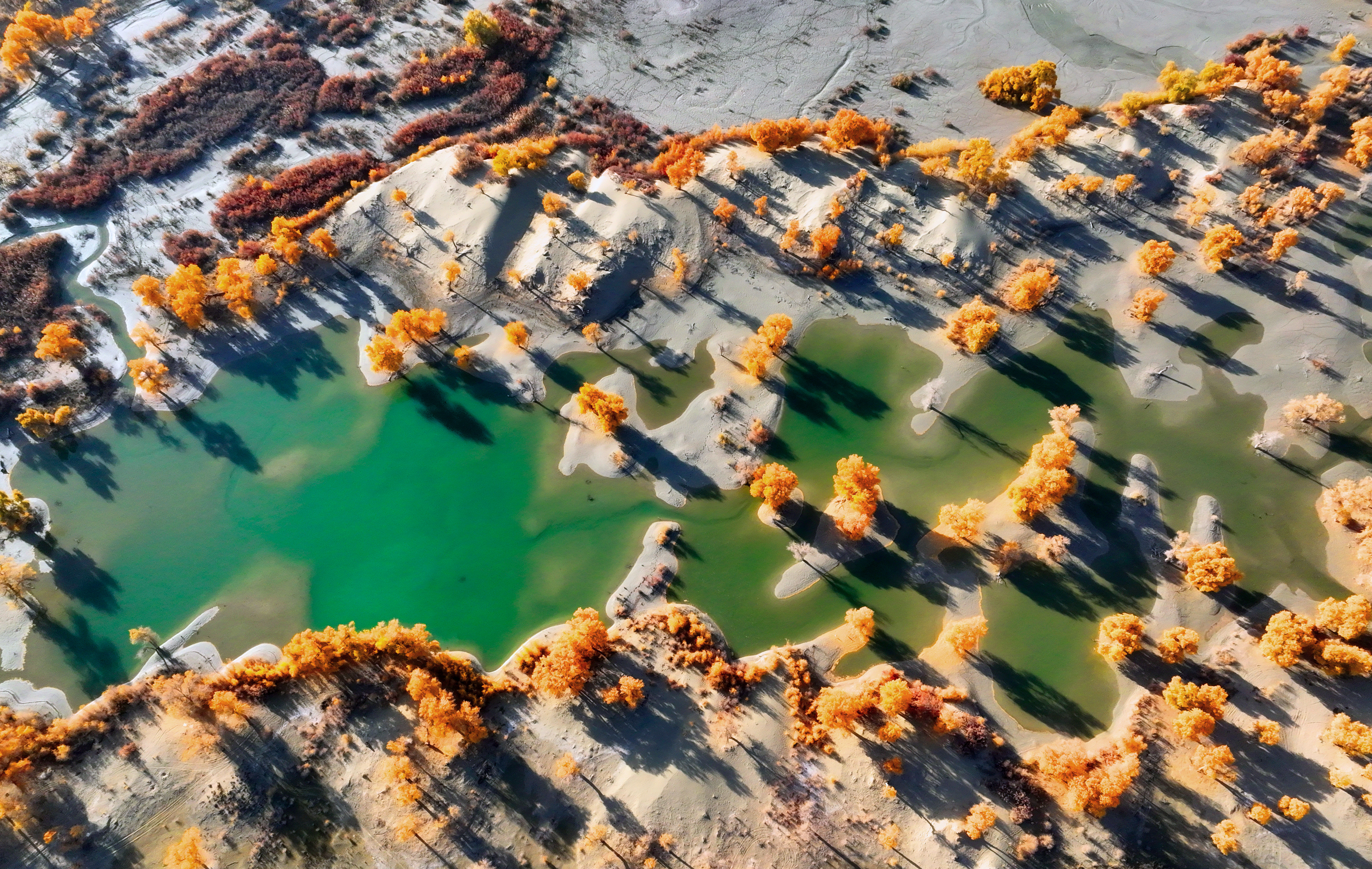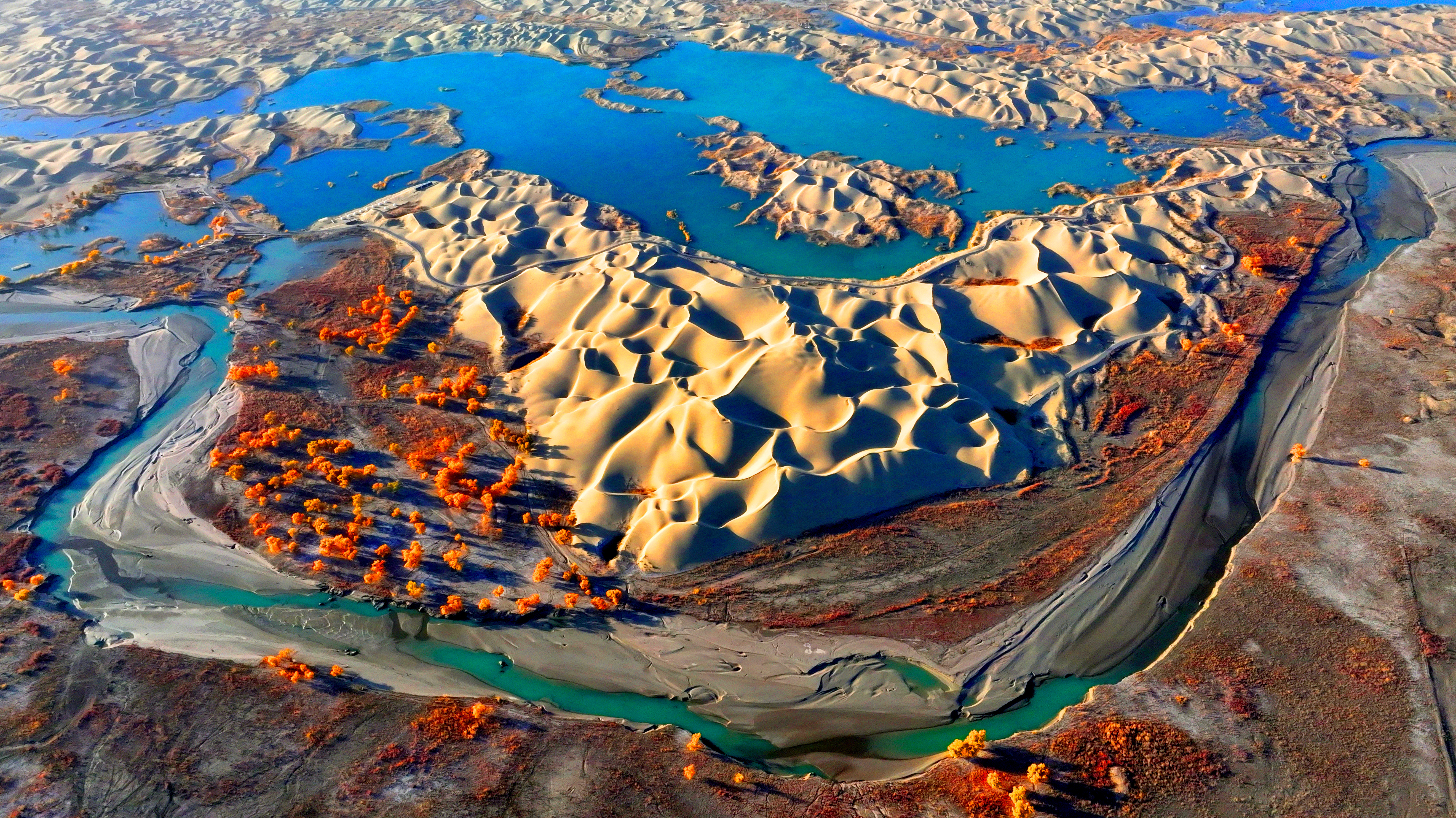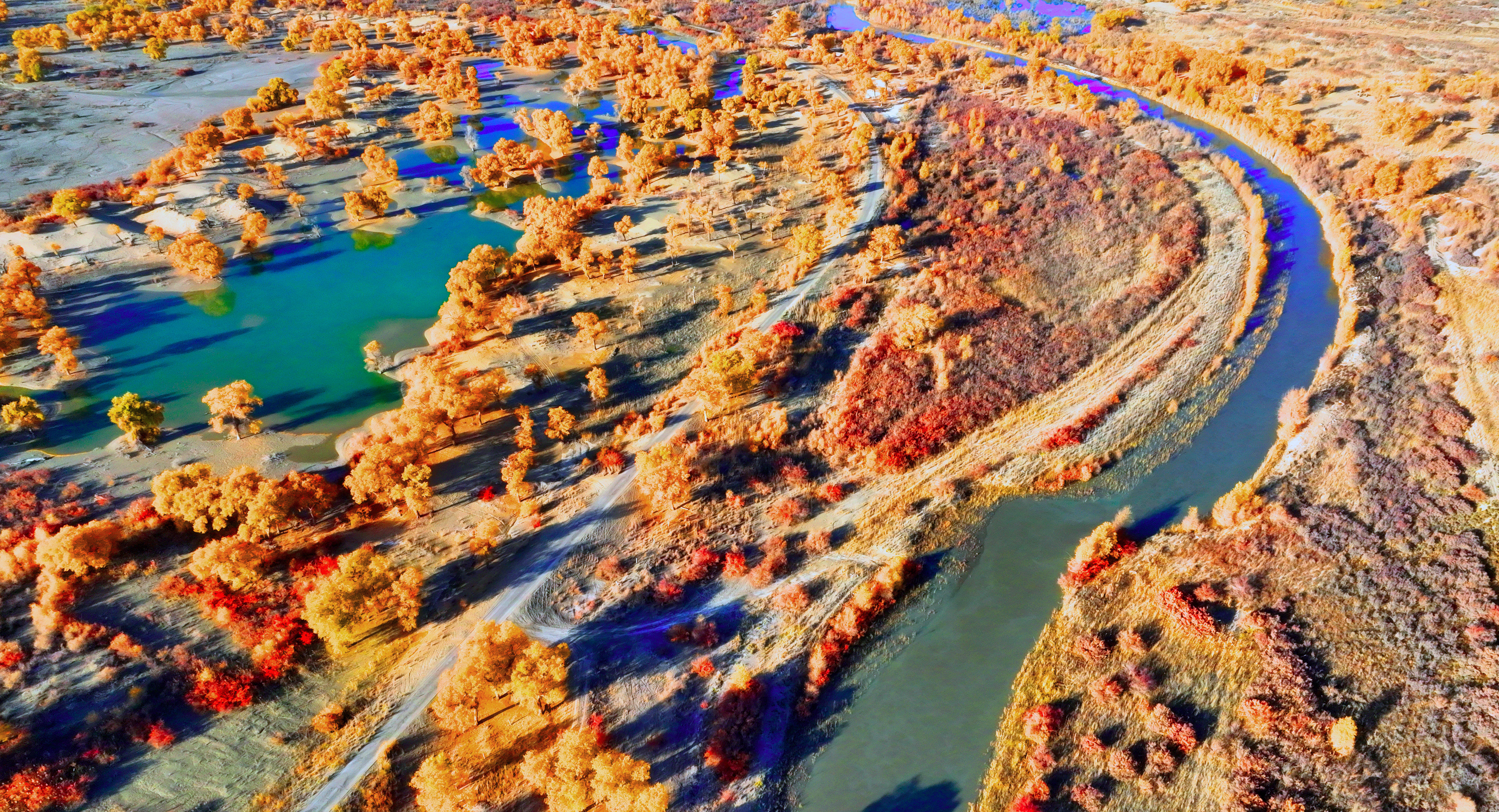 时下的罗布人村寨景区一片绚丽秋景,从高空俯瞰胡杨层林尽染,犹如一幅壮丽的画卷徐徐展开。罗布人村寨集合了沙漠、胡杨、河流、湖泊等自然景观,拥有独特的生态环境和美丽的自然风光。确·胡热摄