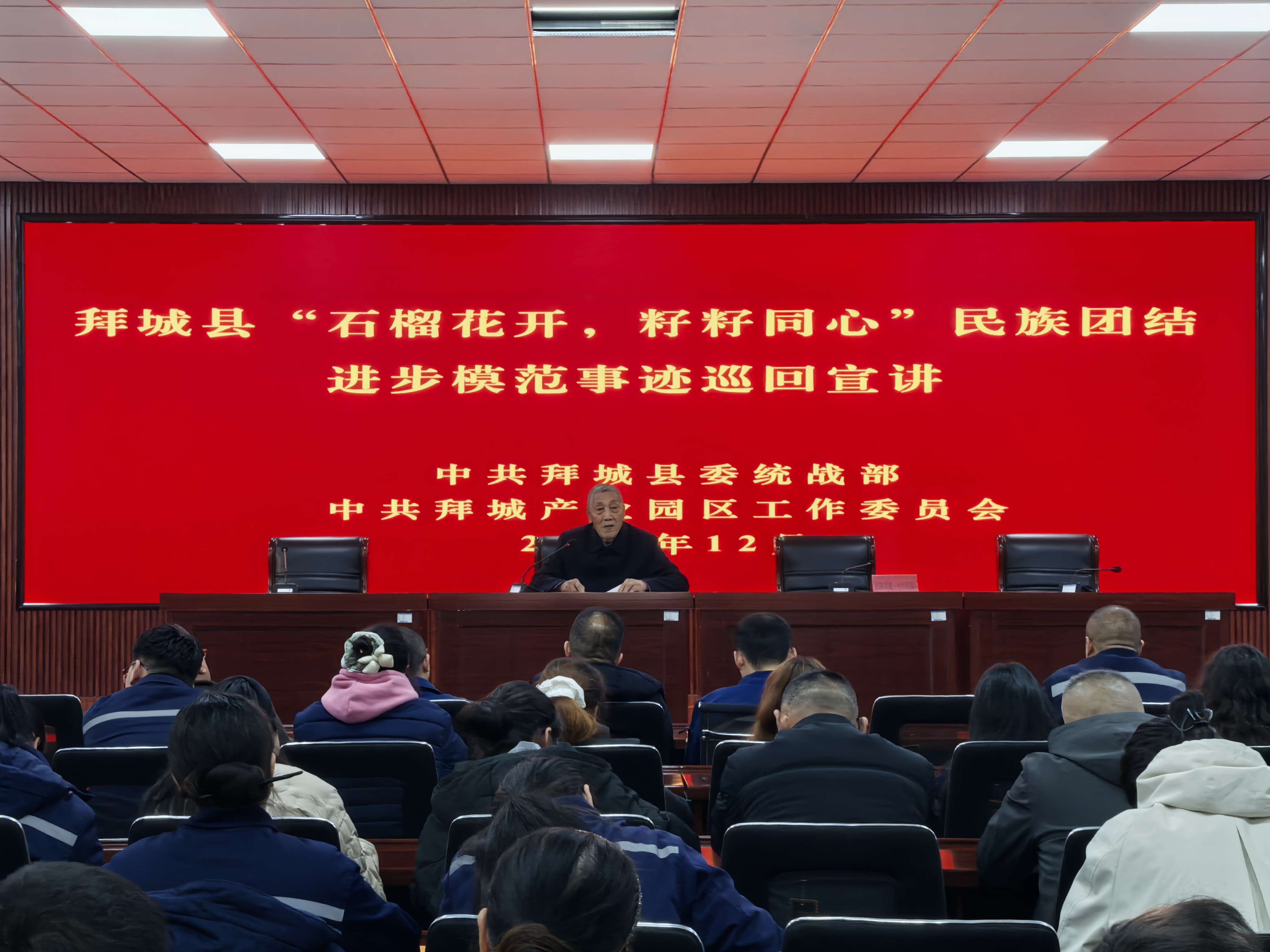 12月4日,在拜城产业园区内,企业代表及干部职工等230余人齐聚一堂,共同参与“石榴花开·籽籽同心”民族团结进步模范事迹巡回宣讲活动。活动以“身边人讲身边事”的形式,通过真实故事传递团结力量,进一步铸牢中华民族共同体意识。