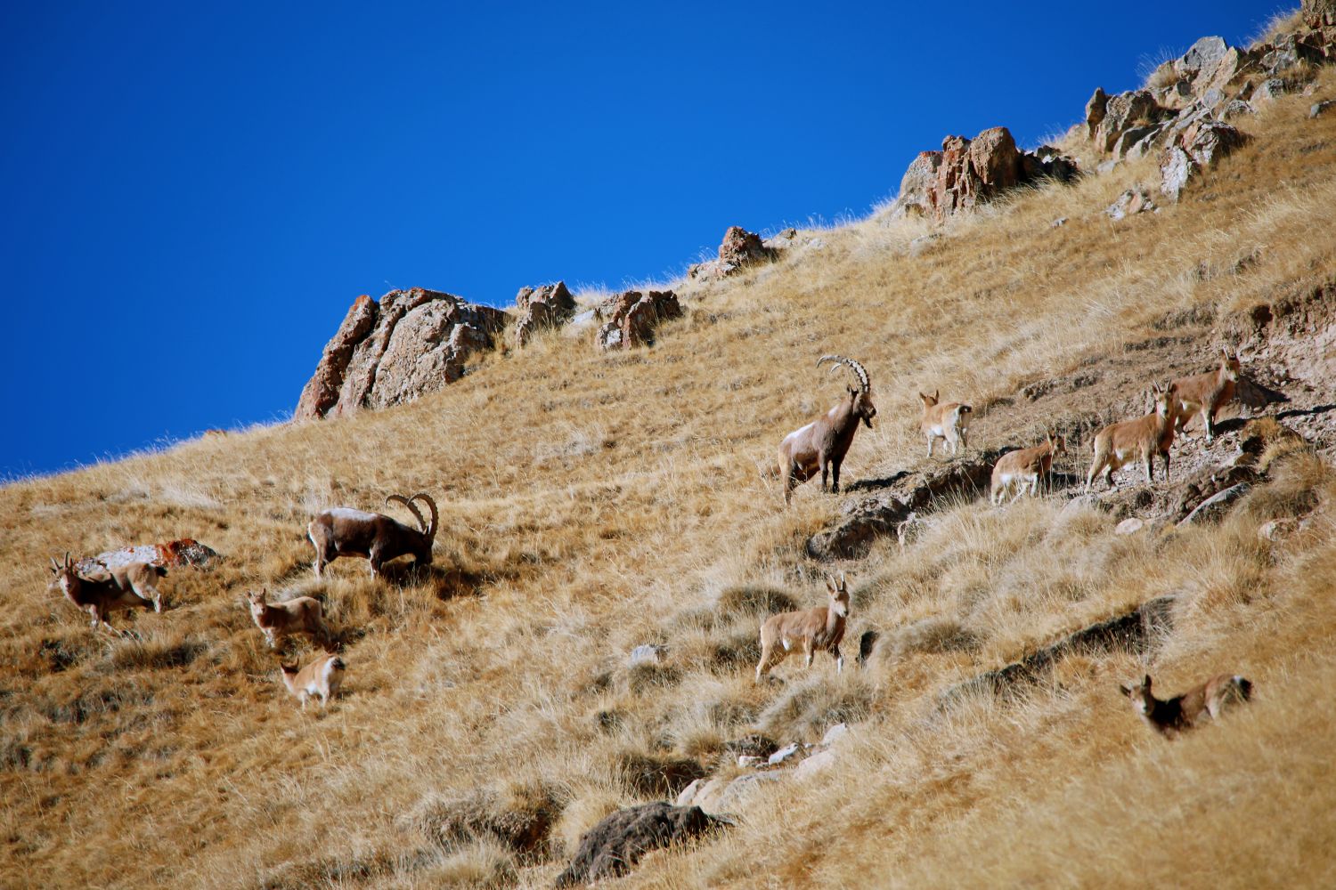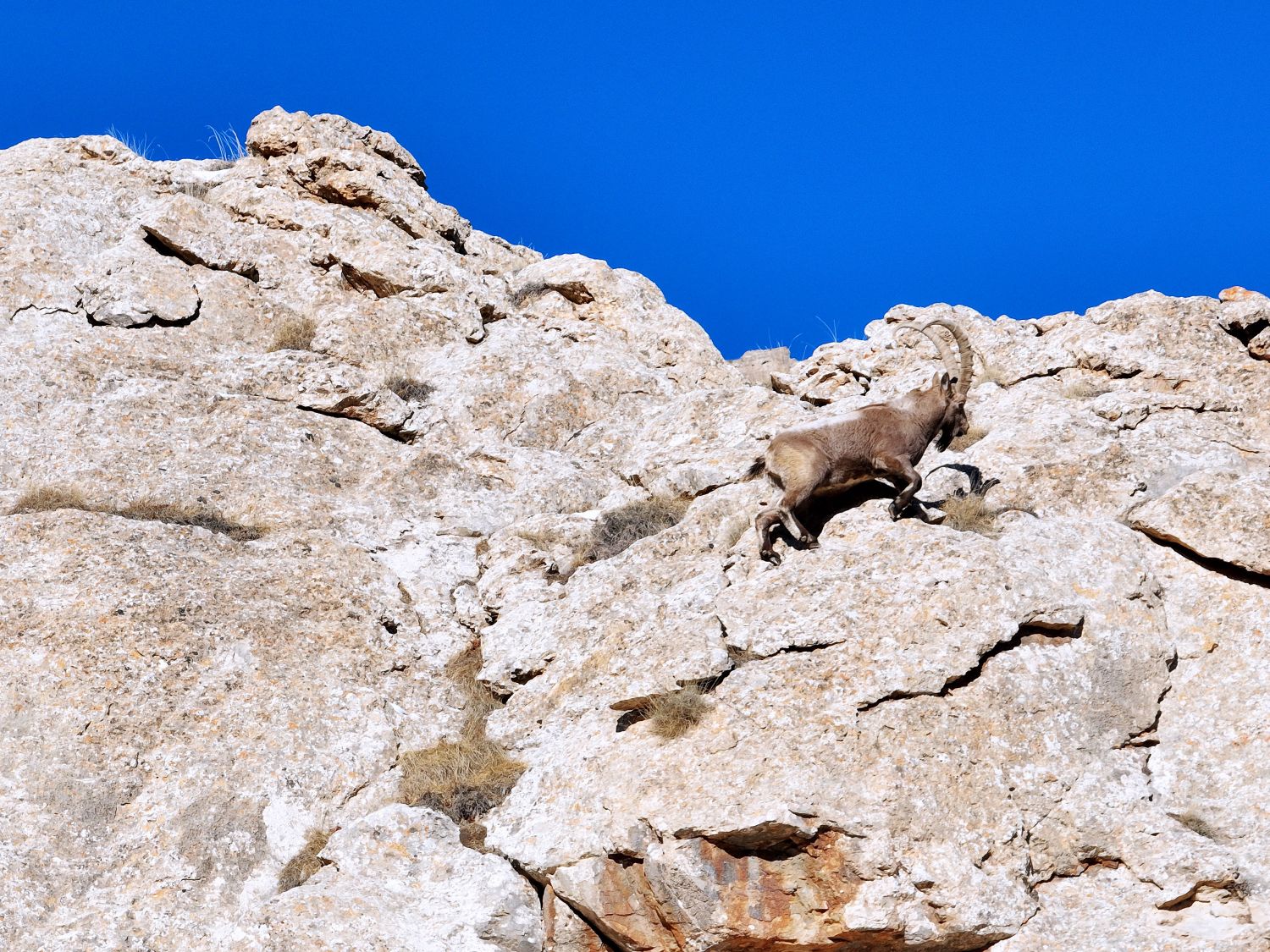 1月8日,在库车市大小龙池景区,一群下山觅食的北山羊在陡峭的岩壁间腾挪跳跃。近年来,得益于地区各地持续开展生态文明建设和不断加大野生动物保护力度,生态环境越来越好,野生动物数量明显增加。