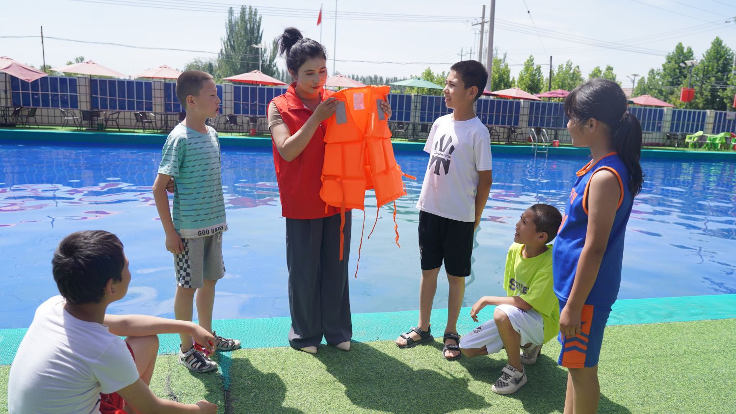 6月24日,地委组织部驻温宿县托乎拉乡思源村工作队在村游泳池,面向辖区少年儿童开展夏季防溺水安全知识讲解。图为工作人员向孩子们讲解救生衣的用法。 通讯员 杜军 摄