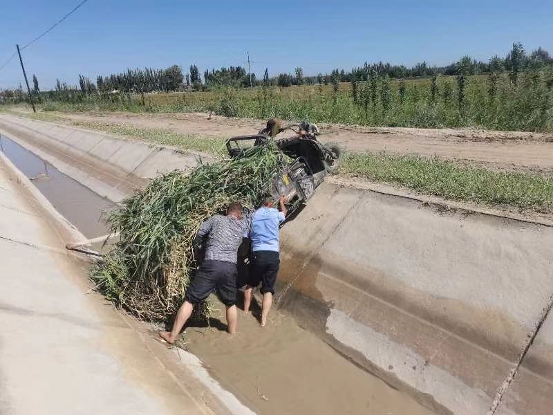8月5日,库车市公安局阿克吾斯塘派出所民辅警在开展日常巡逻时发现群众正试图将陷入水渠的一辆三轮电动车推回路面。见状,民警立即上前查看情况,原来是车主因操作不当忘导致车辆溜车侧翻入沟渠,所幸无人员受伤。