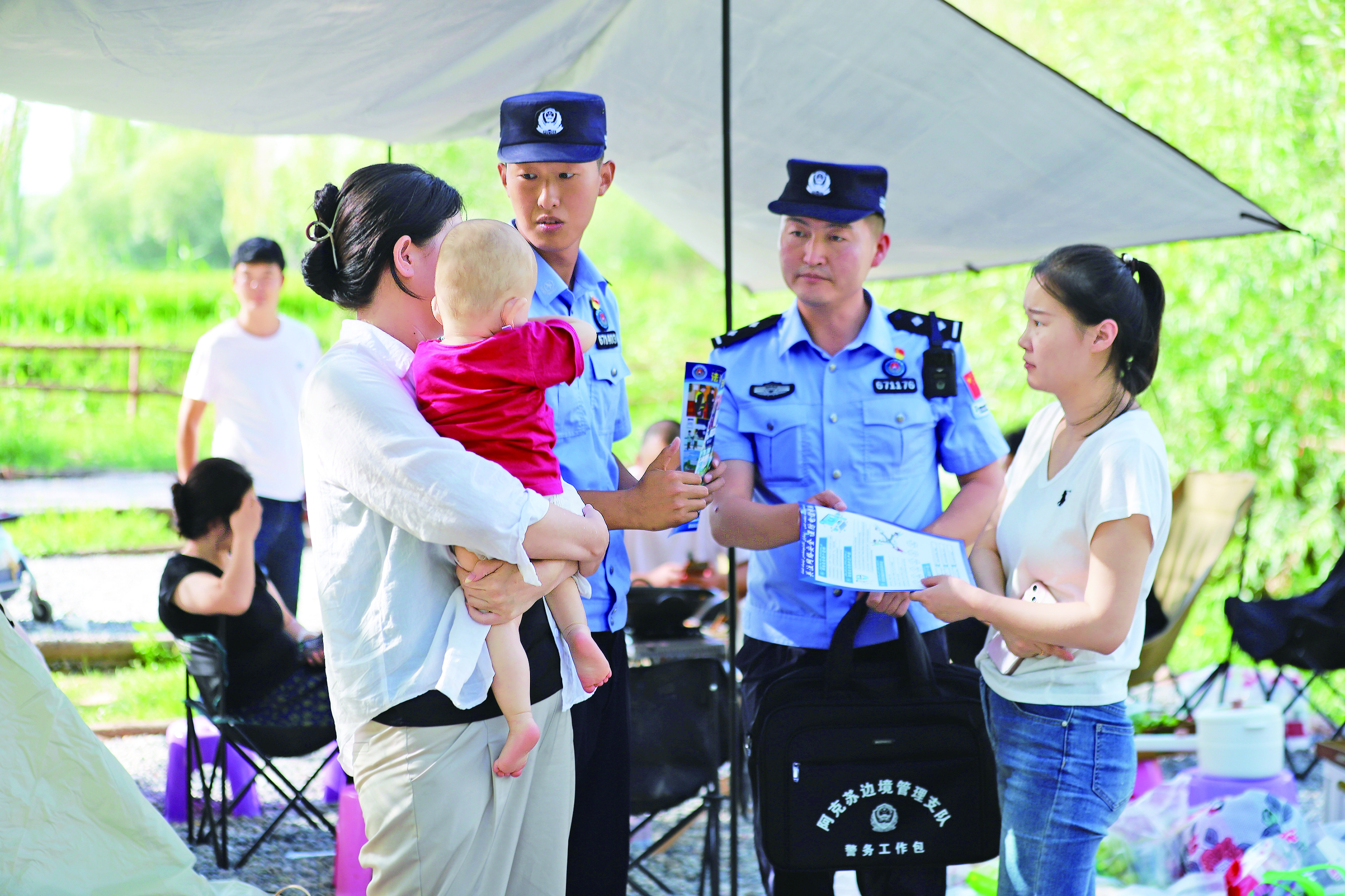 高温下,户外露营持续火热。8月3日,新疆出入境边防检查总站阿克苏边境管理支队吐木秀克边境派出所民警走访辖区露营基地,重点检查消防设施、安全警示、电器线路及明火禁令执行情况,营造安全有序的露营环境。