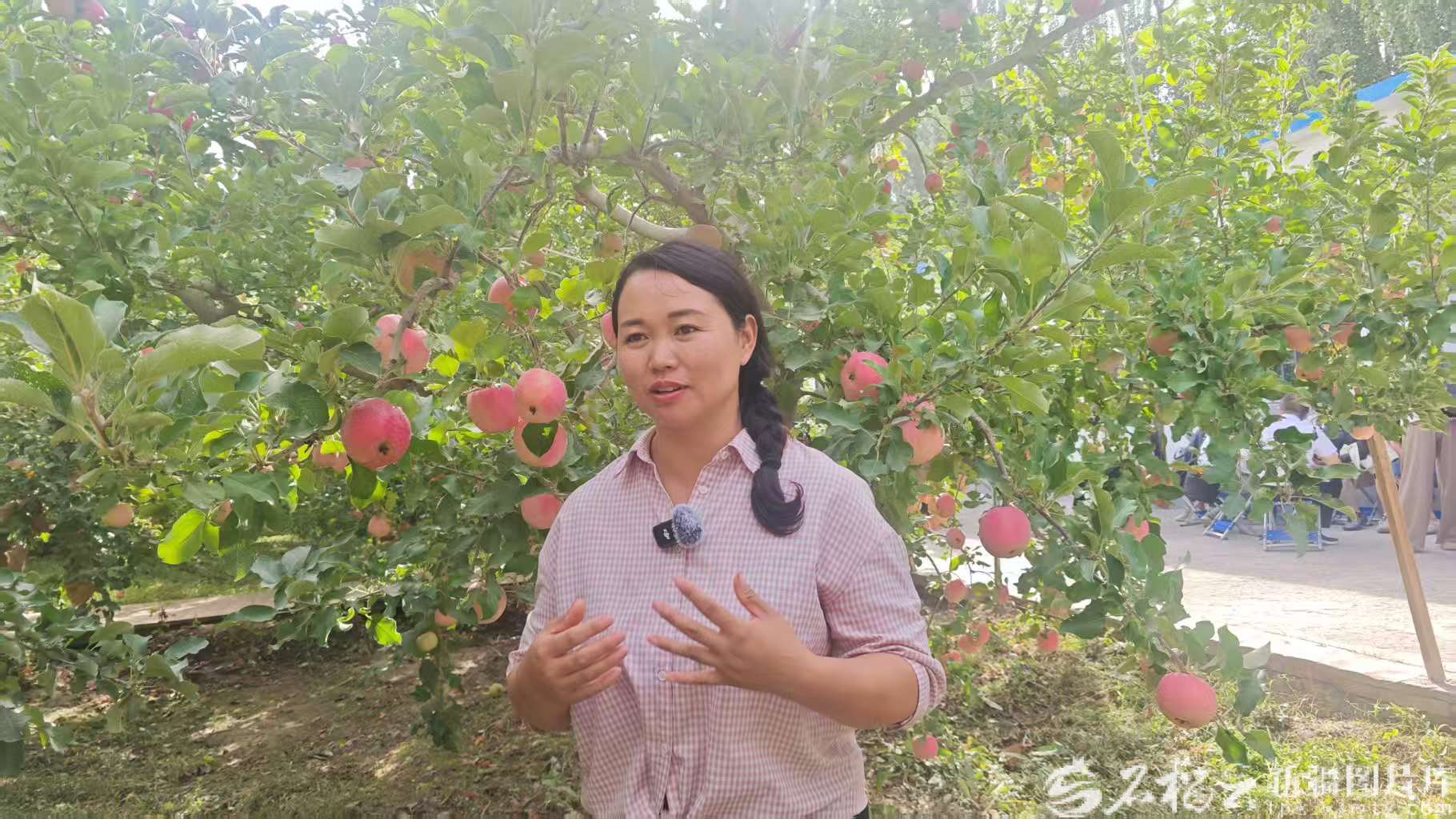 阿克苏地区丰庆园果品农民专业合作社苹果示范园内,果农王云芝站在挂满果实的果树前,对着手机镜头热情讲解。天山网-新疆日报记者 张婷摄