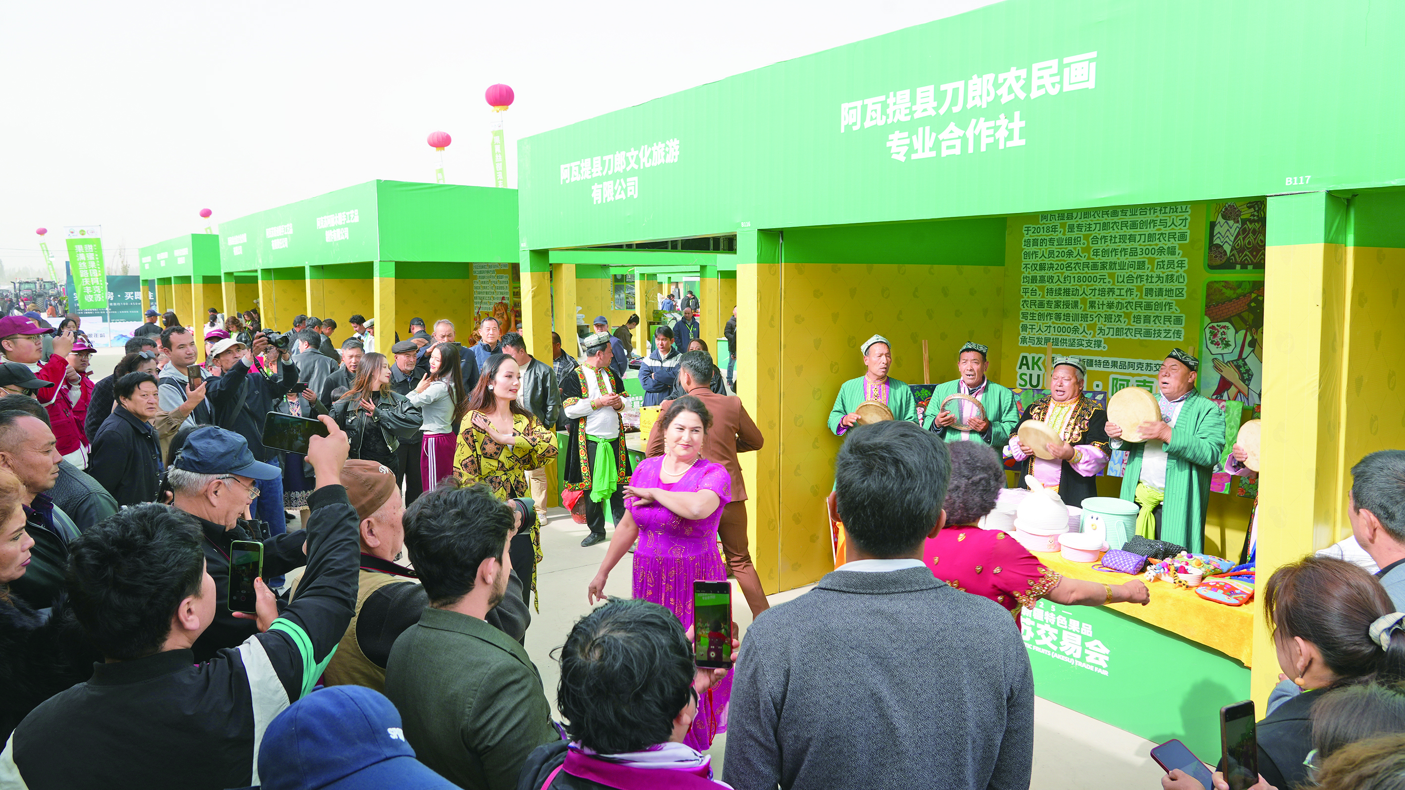 阿瓦提县文旅产品展位前不少观众跳起欢快的麦西热甫。记者 吕娜 摄