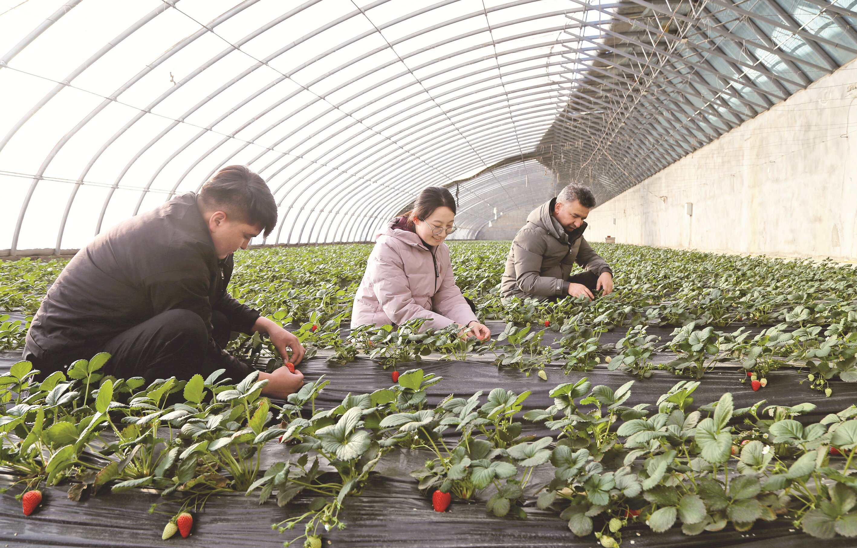 12月1日,在阿瓦提县塔木托格拉克镇玉斯屯克阿热勒村一处温室大棚内,农技人员帮农民采摘草莓的同时认真讲解草莓种植注意事项。