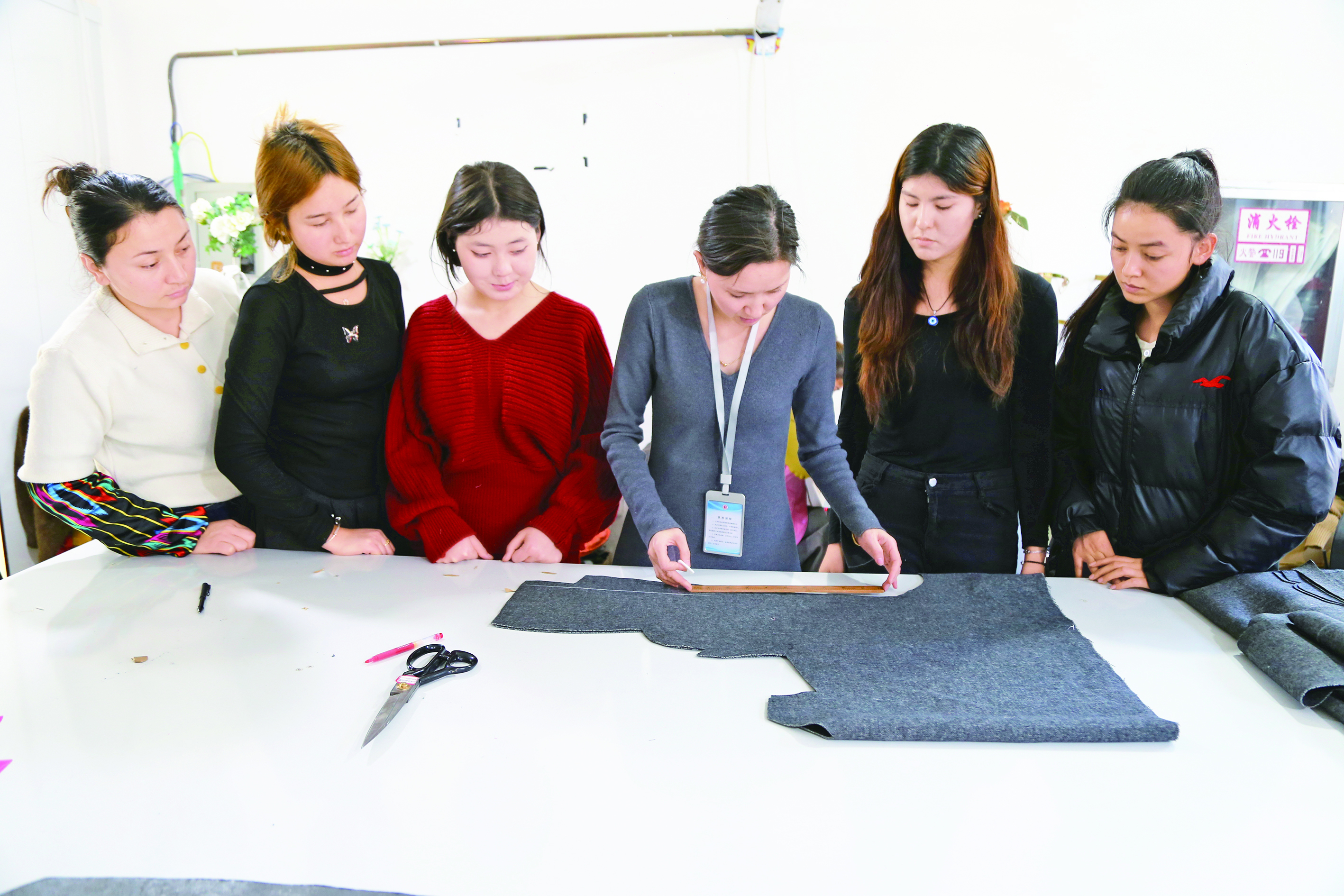12月9日,在阿瓦提县阿瓦提镇锦绣社区米唯依美服装设计培训中心,技能名师正在向新员工传授缝纫技术。