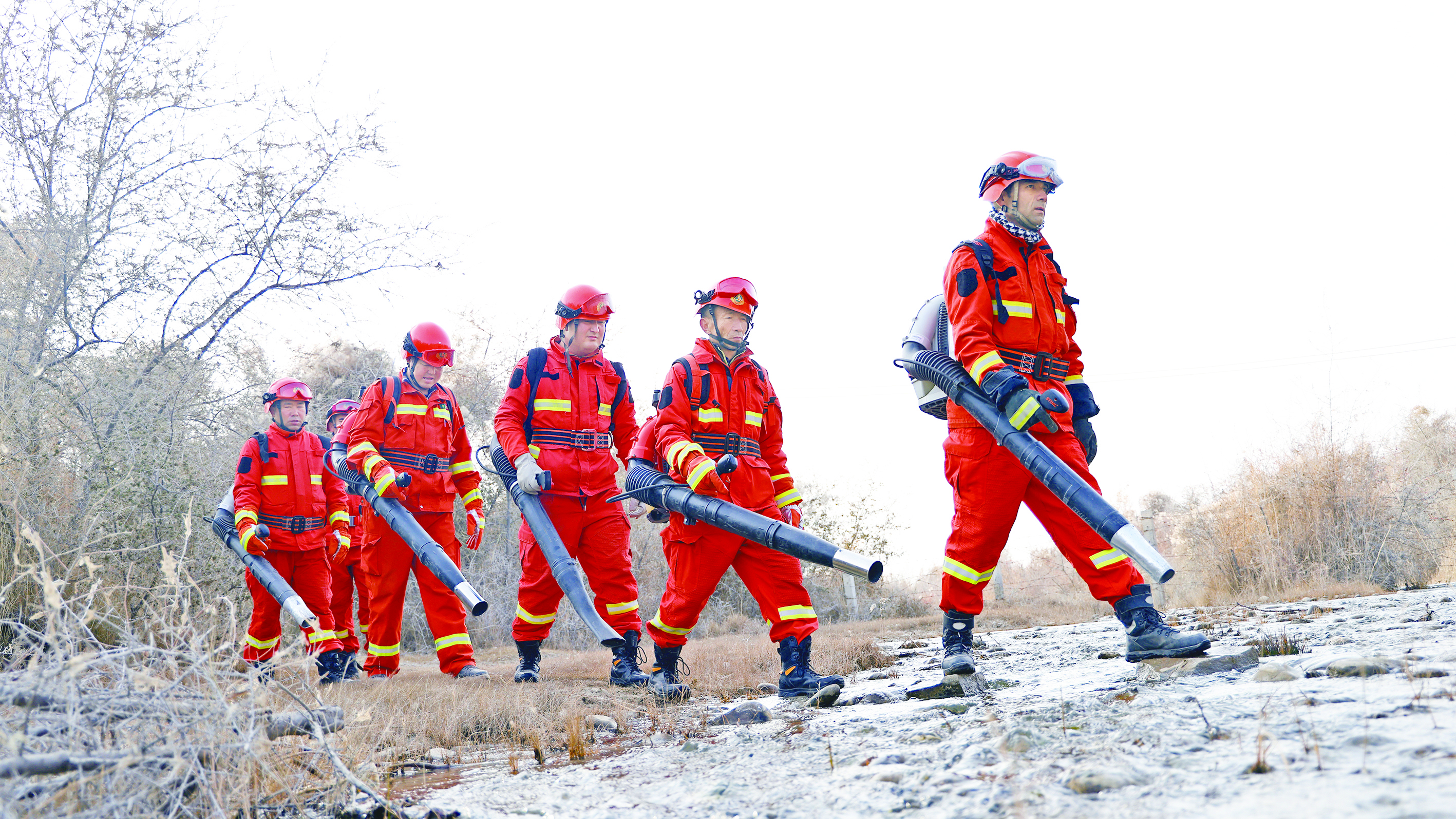 乌什县奥特贝希乡公益林管护站消防应急分队队员身着防护服穿行在茫茫林区,默默守护着这片绿色屏障。 通讯员 鲁提普拉·木塔力甫 摄