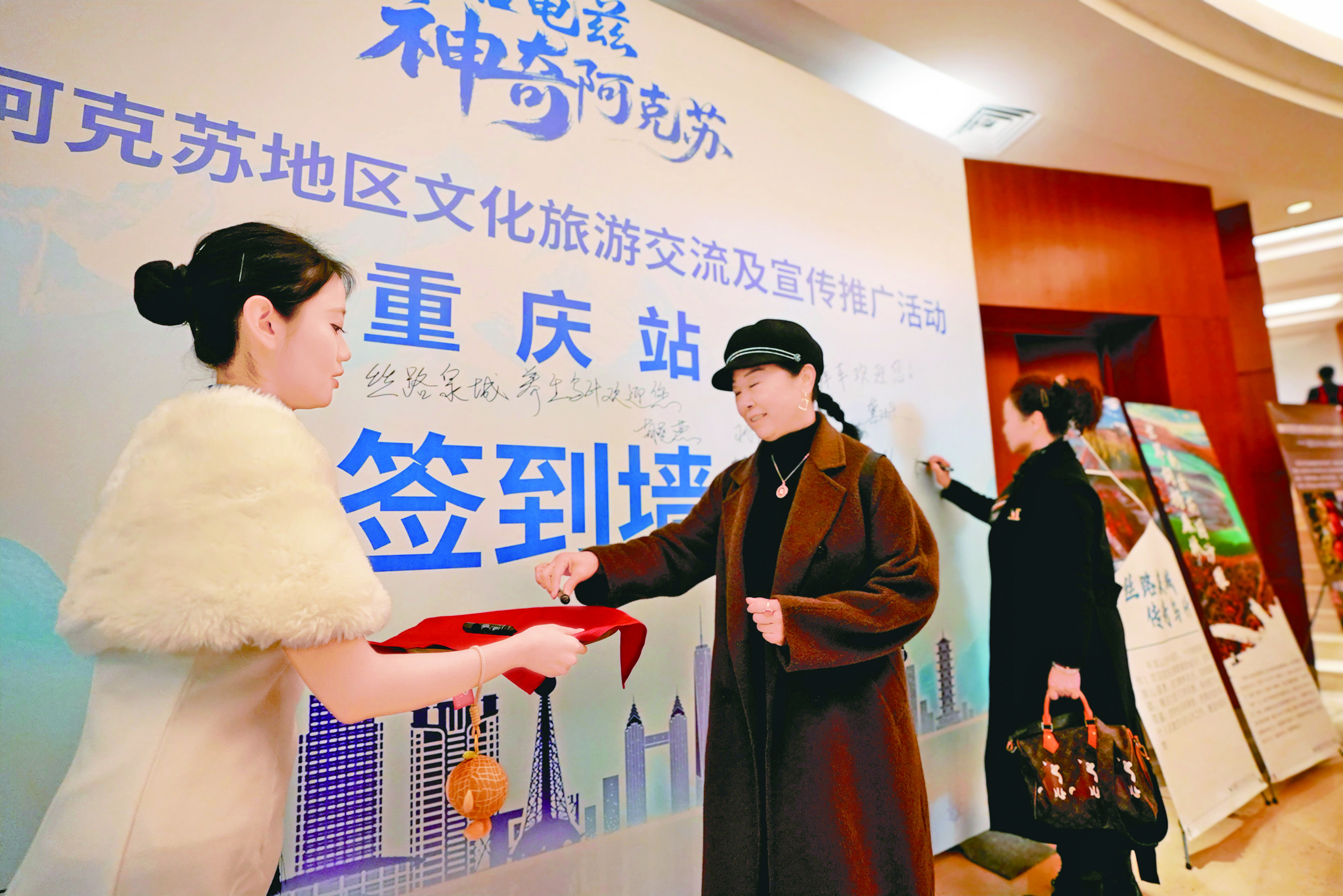 2025年阿克苏地区文化旅游交流及宣传推广活动在重庆市举行,嘉宾在签到墙留言。