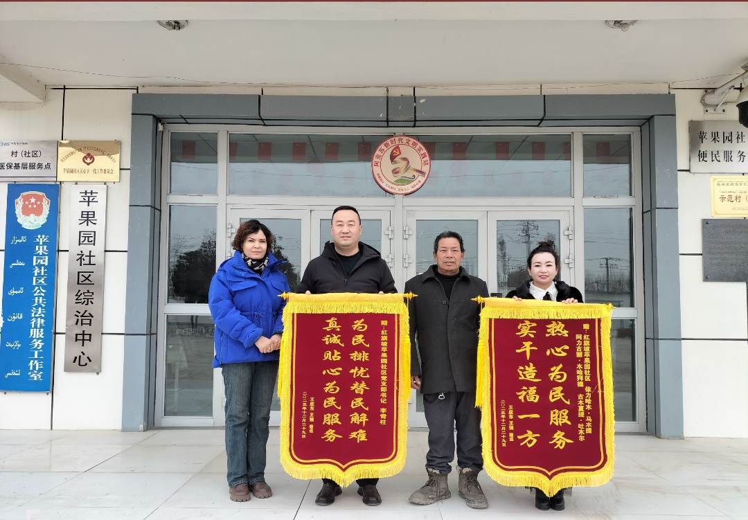 阿克苏新闻网/阿克苏地区融媒体中心讯(通讯员 王玉芝)12月29日,一面印有“真诚贴心为民服务,为民排忧替民解难”字样的锦旗,由新纳入低保保障的居民王应东送至阿克苏商贸物流产业园(红旗坡片区)苹果园社区。