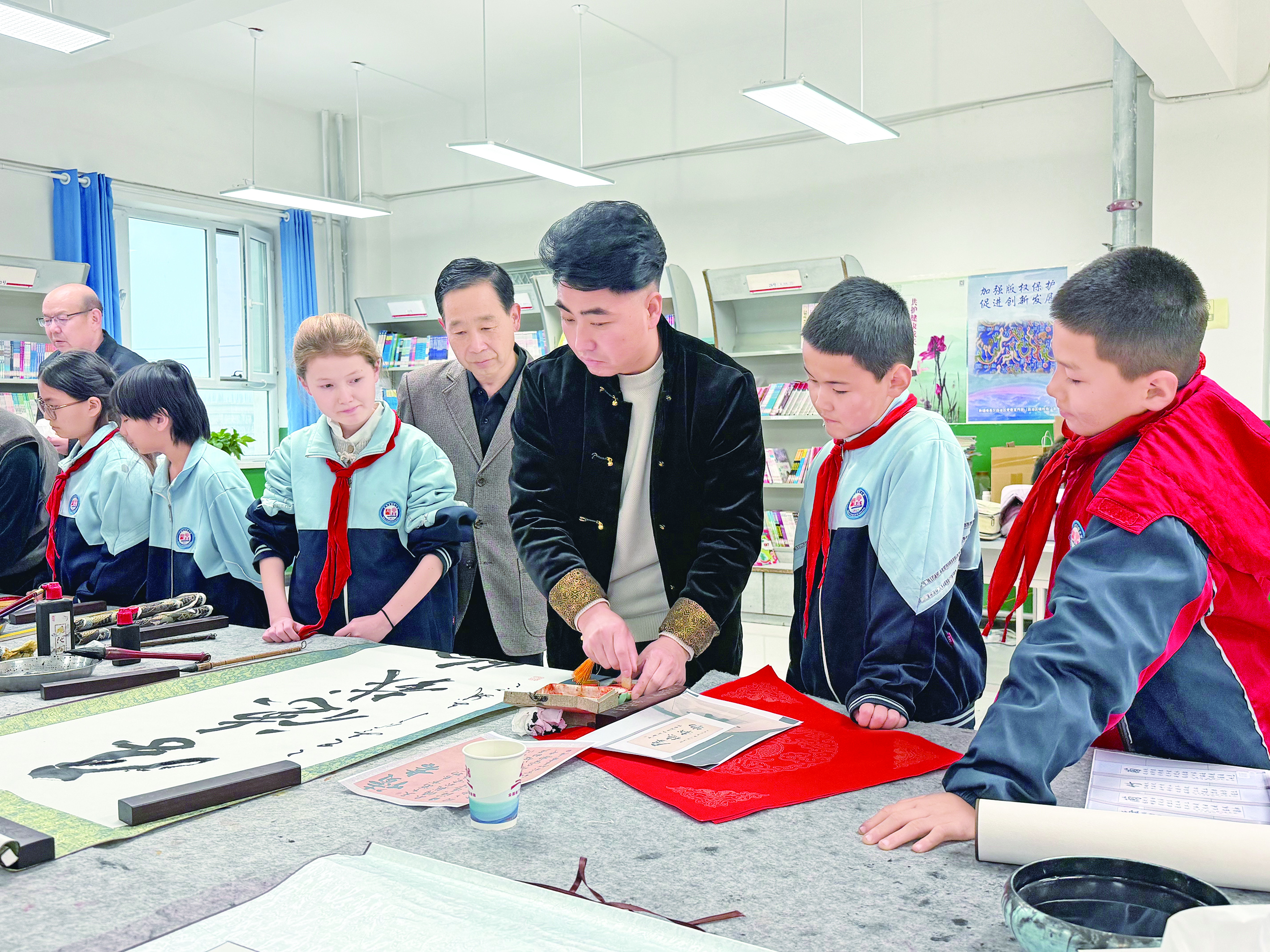 2025年12月31日,沙雅县文联组织书法家协会骨干走进该县第四小学,开展“墨香迎新年 文化润校园”活动。书法家们挥毫泼墨,为师生送上新年祝福。  通讯员 祖丽皮耶·艾麦尔 摄