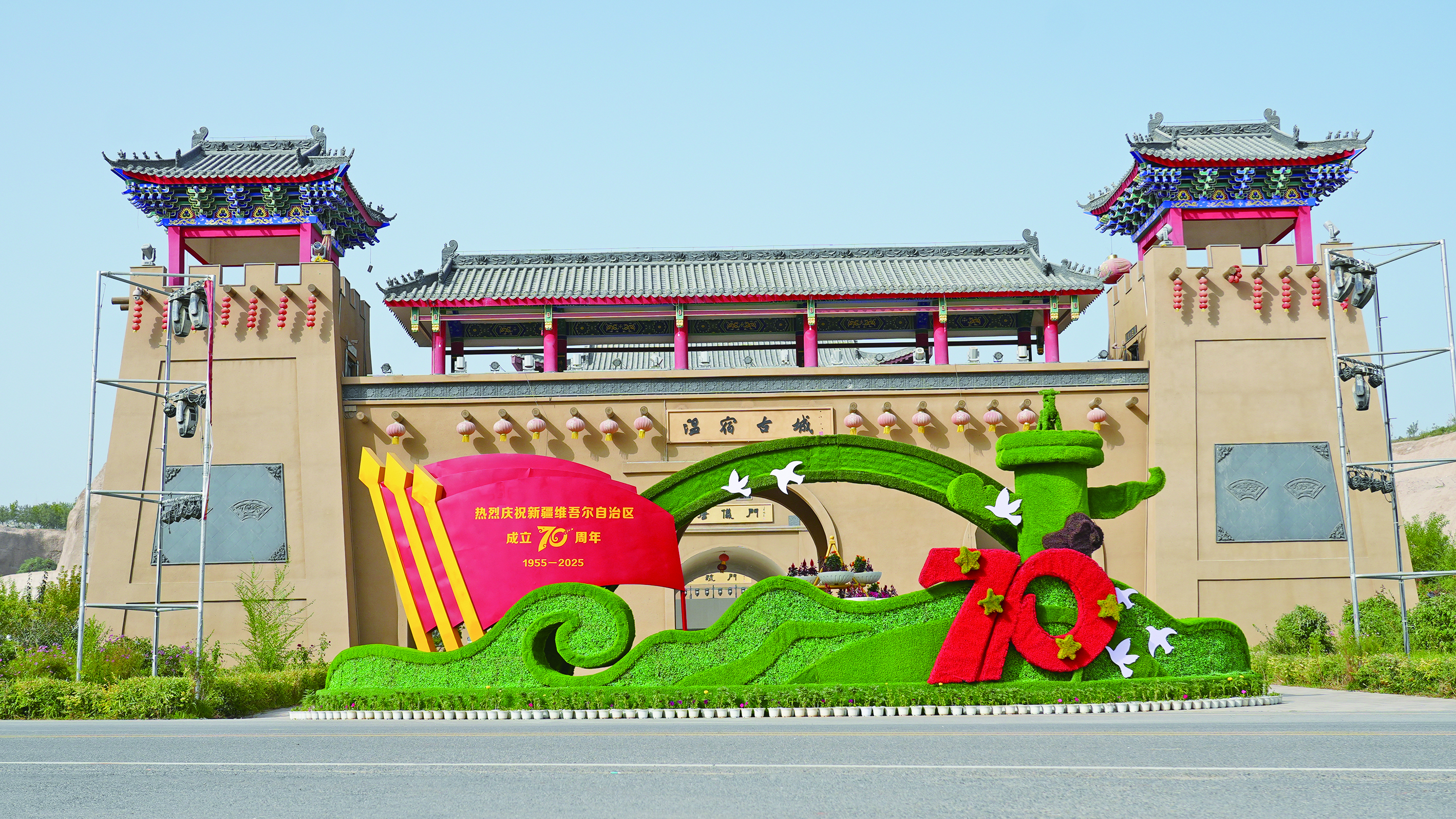 2025年9月21日,温宿古城前搭建起以“庆祝新疆维吾尔自治区成立70周年”为主题的城市绿雕。 通讯员 赵新昌 摄
