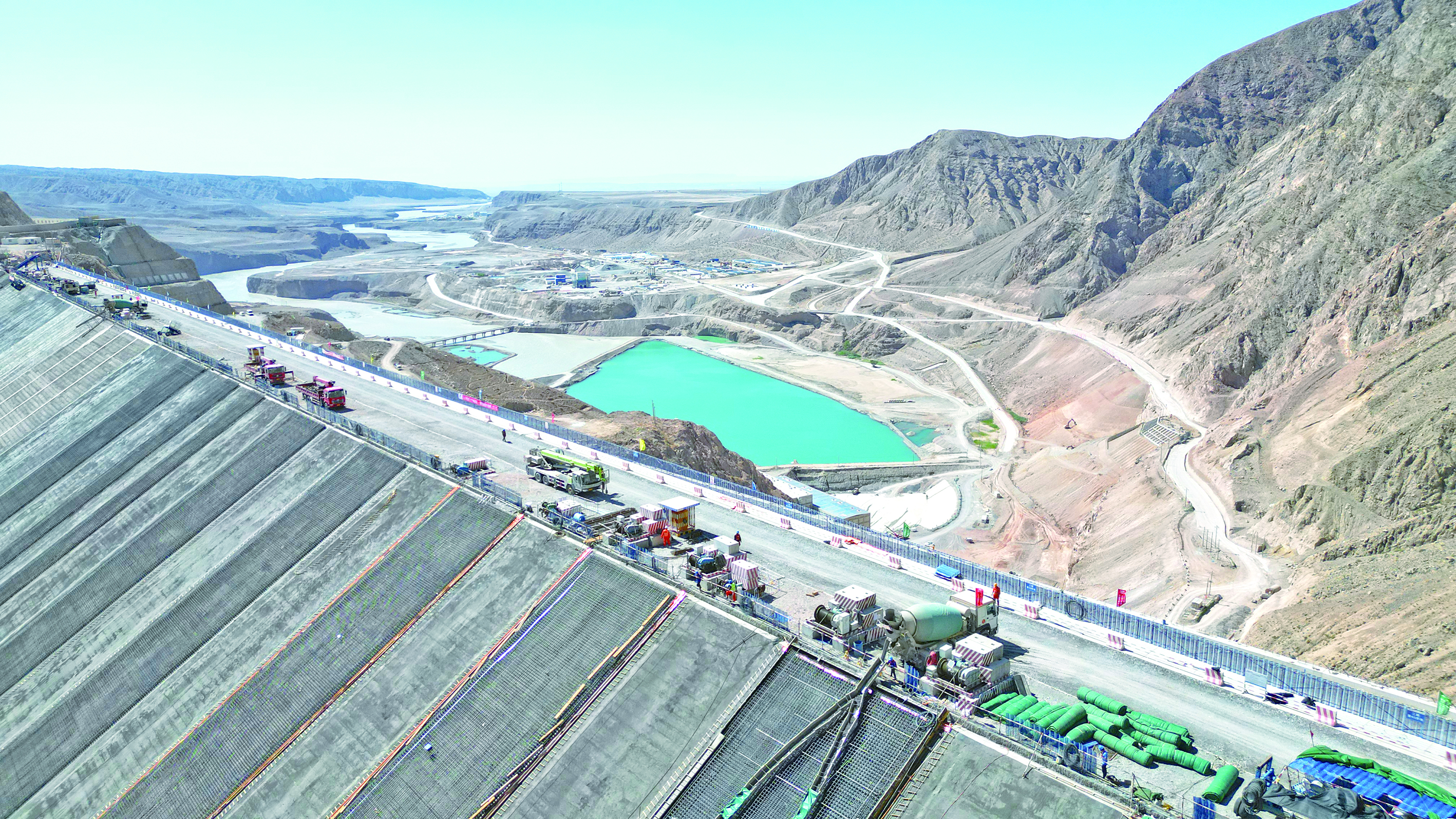 2025年6月18日,新疆大石峡水利枢纽工程大坝正在进行三期混凝土面板浇筑工作。 记者 赵士杰 摄