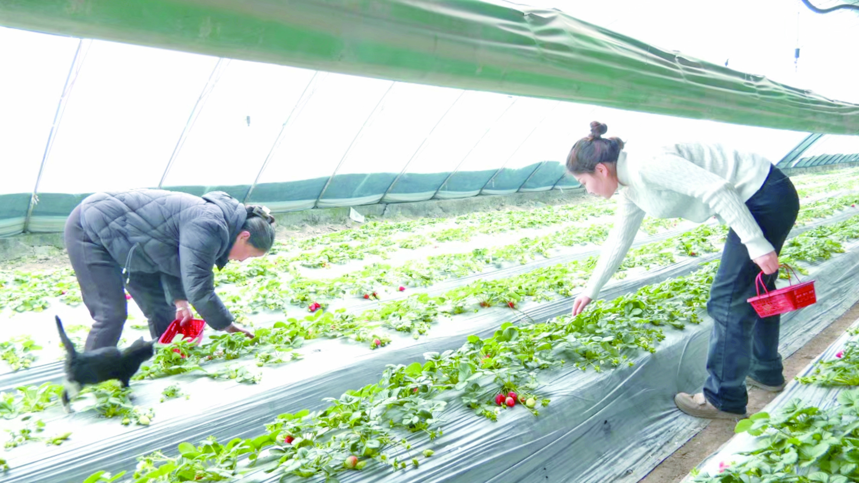 1月6日,拜城县米吉克乡园艺村的草莓大棚内,游客正在采摘草莓。 通讯员 黄春宇 摄