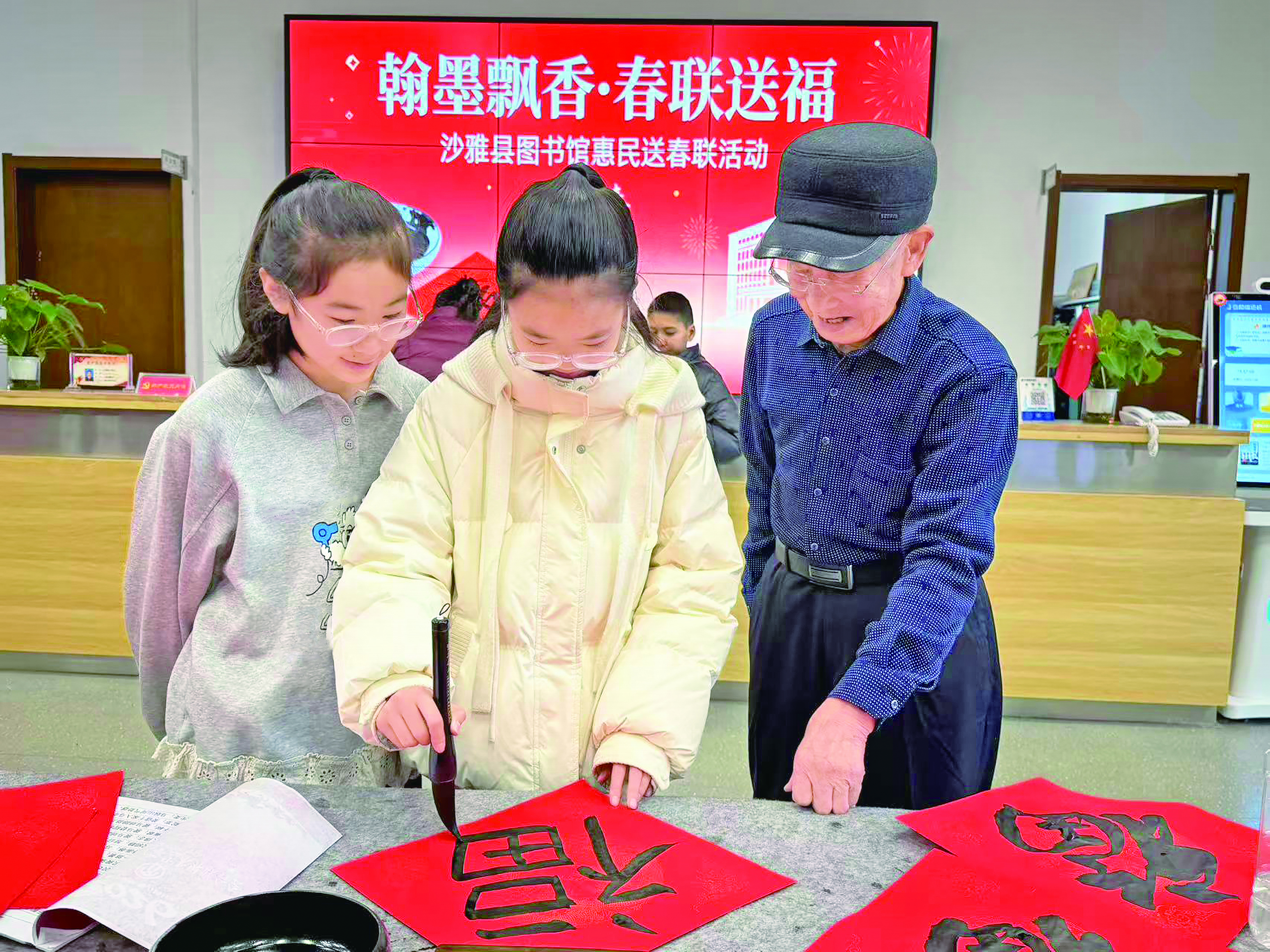 1月31日,沙雅县图书馆联合县文联开展“翰墨飘香·春联送福”文化惠民活动,孩子们正在体验书写乐趣。 通讯员 祖丽皮耶·艾麦 摄