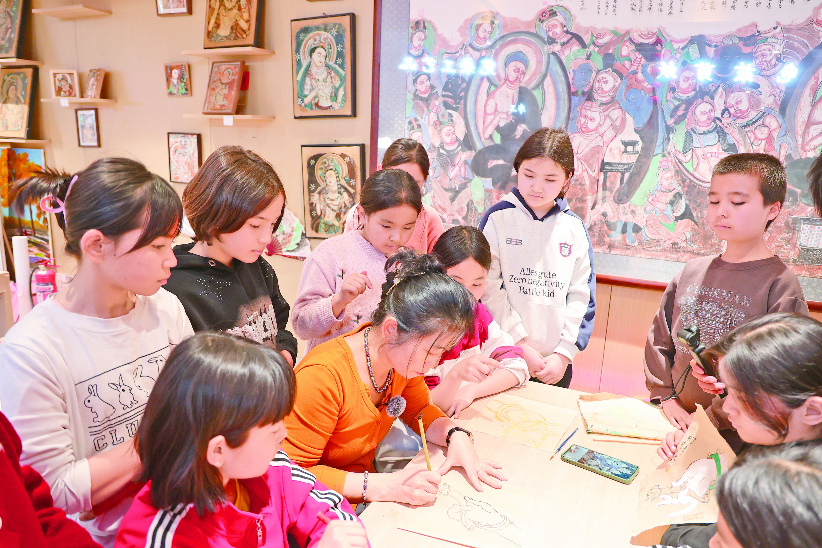3月22日,在库车市非遗工坊龟兹壁画体验区,指导老师现场向学生示范壁画绘制技法。