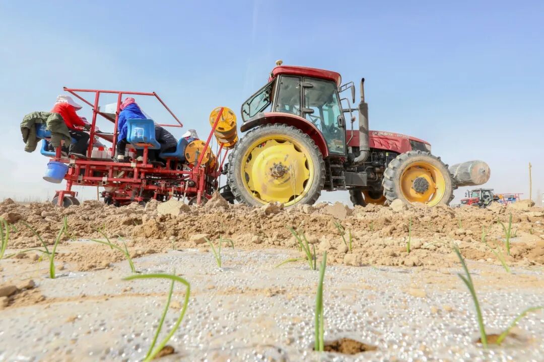 3月23日,在库车市牙哈镇吾斯塘博依村洋葱种植基地,洋葱移栽机匀速作业,一次性完成铺膜、铺设滴灌带、栽苗等工序。通讯员卜登鹏 摄