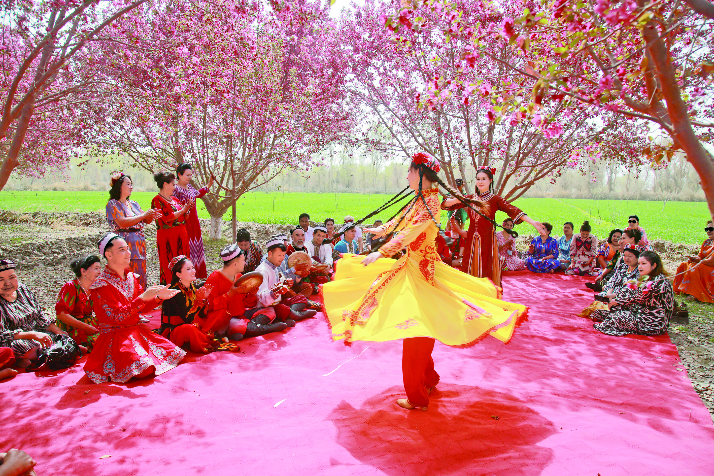 近日,阿瓦提县刀郎部落景区的花儿次第绽放,春意盎然。民间艺人倾情演绎特色文艺节目,精彩的表演吸引游客驻足观赏。