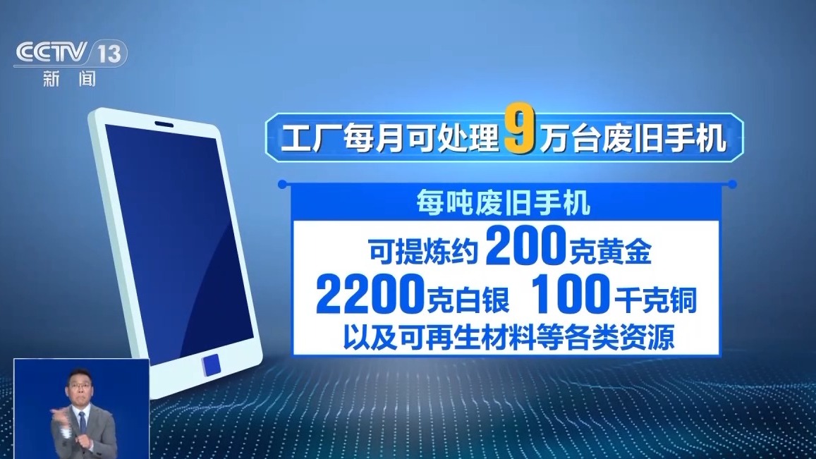记者了解到,这个工厂每个月可以处理9万台废旧手机,在这里每吨废旧手机可以提炼约200克黄金、2200克白银、100千克铜以及可再生材料等各类资源。