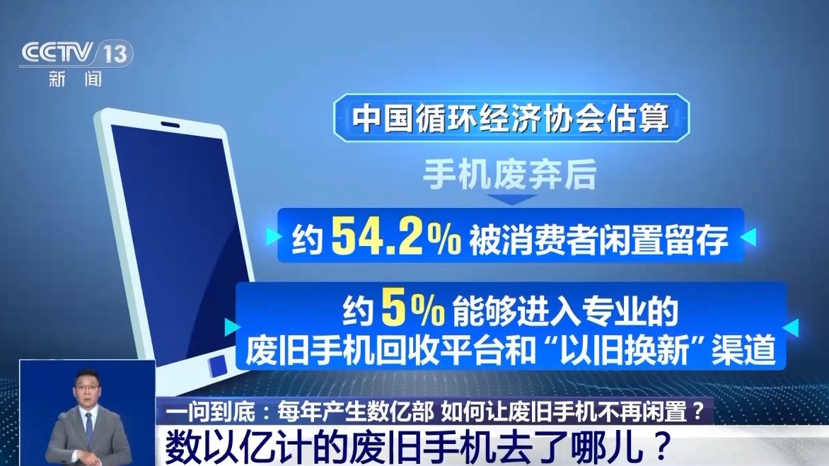 废旧手机循环利用好处有很多,然而记者了解到,目前废旧手机的回收情况并不乐观。中国循环经济协会估算,手机废弃后,约54.2%被消费者闲置留存,只有约5%能够进入专业的废旧手机回收平台和“以旧换新”渠道。这些闲置的废旧手机不仅是资源的浪费,如果随意丢弃更会污染我们的环境。