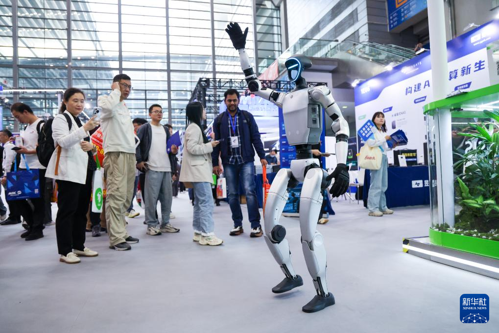 4月9日,观众在第十三届中国电子信息博览会上观看人形机器人展示。新华社记者 梁旭 摄
