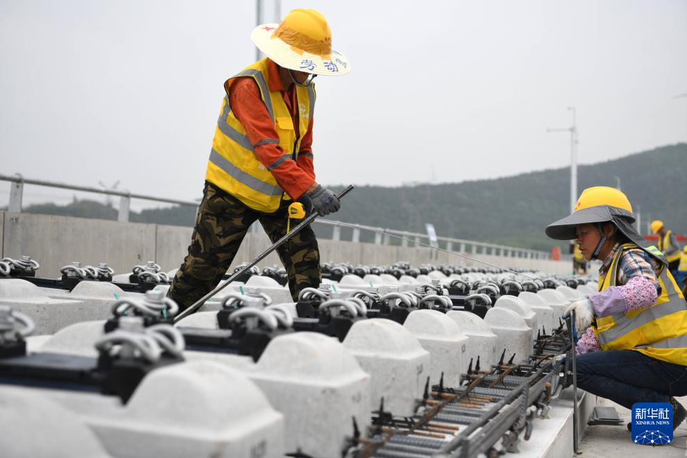 4月24日,在安徽省马鞍山市含山县,中铁四局施工人员在进行巢马城际铁路无砟轨道板铺设施工。新华社记者 刘军喜 摄