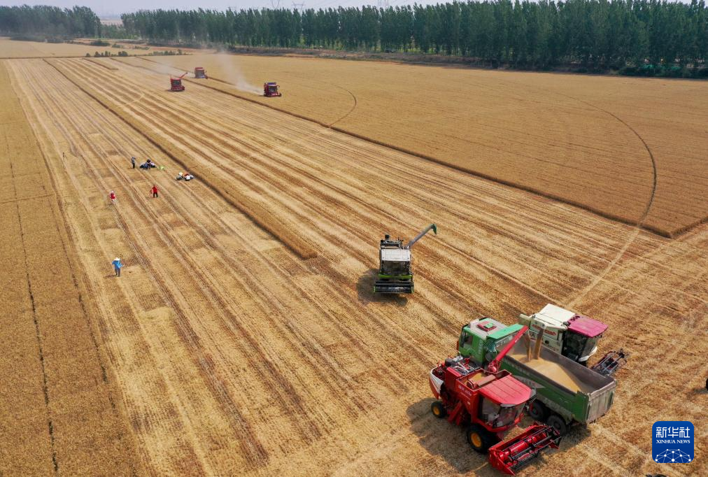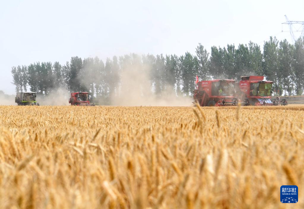 5月28日,在活动现场,农机手驾驶收割机收割小麦。新华社记者 郝源 摄