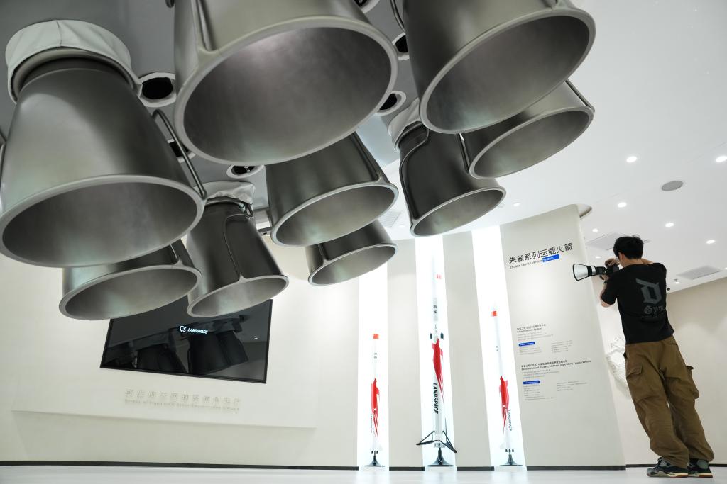 跟随采访团来到位于北京“火箭街区”的蓝箭航天,从展厅内我国首款成功入轨的液氧甲烷运载火箭的回收残骸,到大厅中央1:1复刻的九台发动机并联的朱雀三号尾部模型,无不让记者深切感受到民营火箭企业加速奔跑的蓬勃活力。
