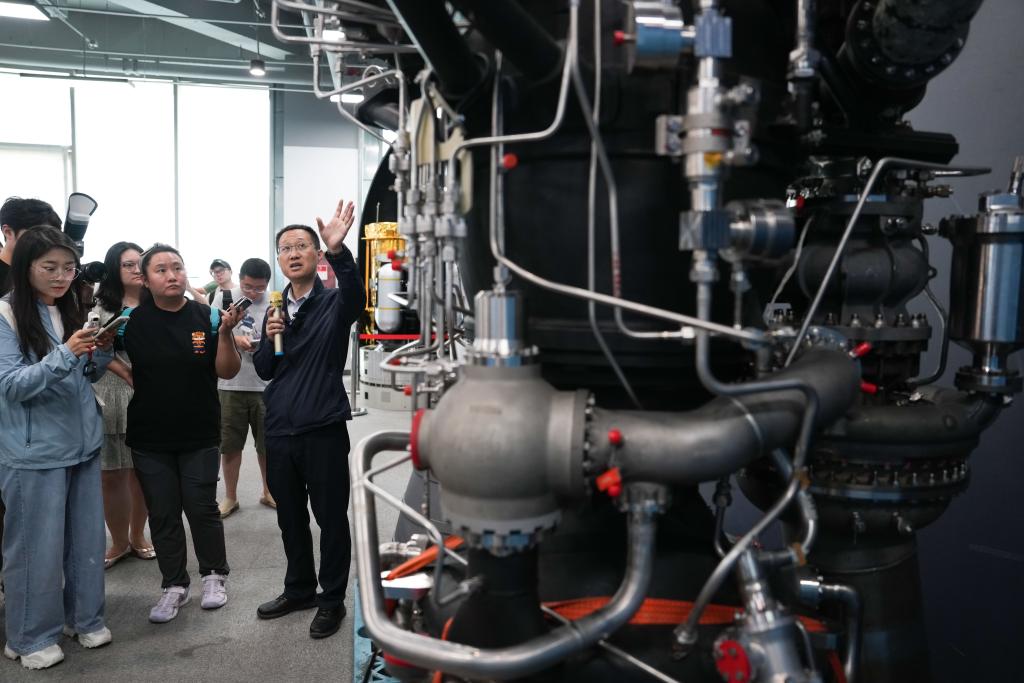 6月18日,星河动力执行总裁夏东坤在北京经济技术开发区向媒体介绍智神星一号运载火箭发动机。新华社记者 郑焕松 摄