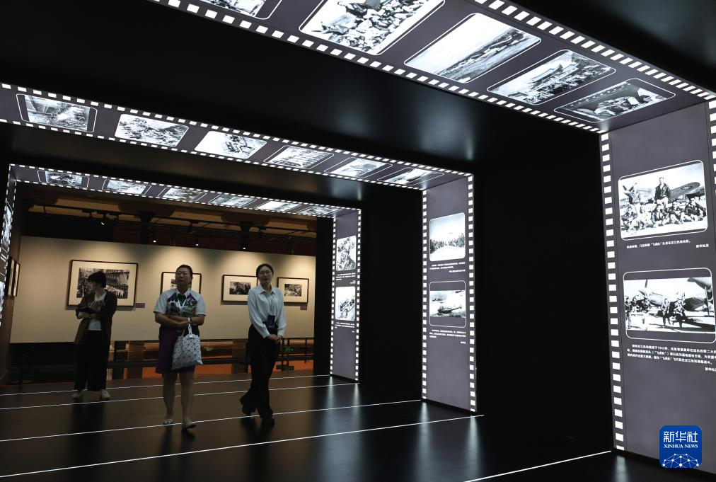 9月1日,参观者在艺术展上展出的抗战主题摄影作品前驻足观看。新华社记者 方喆 摄