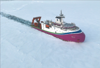 图为“探索三号”在北极密集冰区破冰航行。自然资源部供图