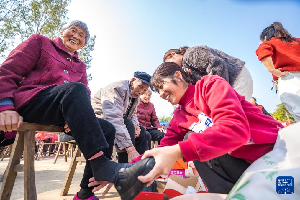 10月28日,在河南省驻马店市西平县师灵镇白庙村,27位八旬长者获赠爱心鞋。这是村妇联工作人员为90岁的孙河信老人穿上爱心鞋。新华社发(赵永涛摄)