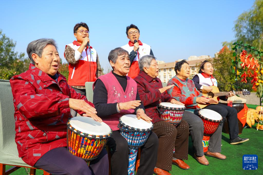 10月28日,在山东省青岛市李沧区社会福利院开展的“爱满重阳”主题活动中,志愿者和老人们一起表演节目。新华社发(张鹰摄)