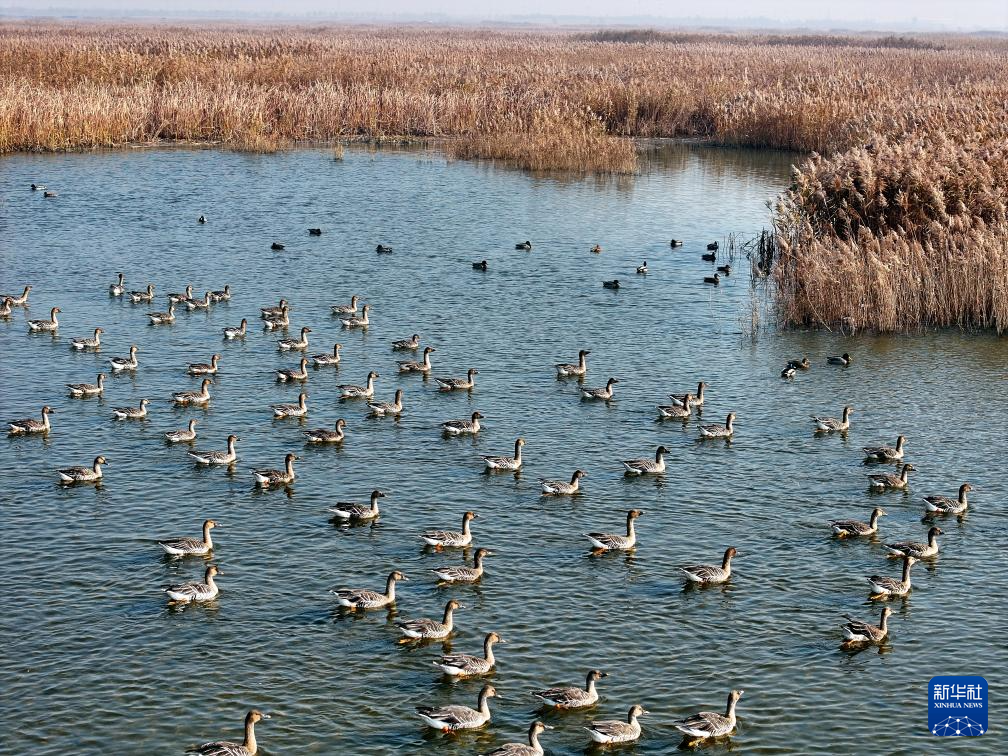 11月30日,群鸟在甘肃张掖国家湿地公园栖息游弋。新华社发(陈礼摄)