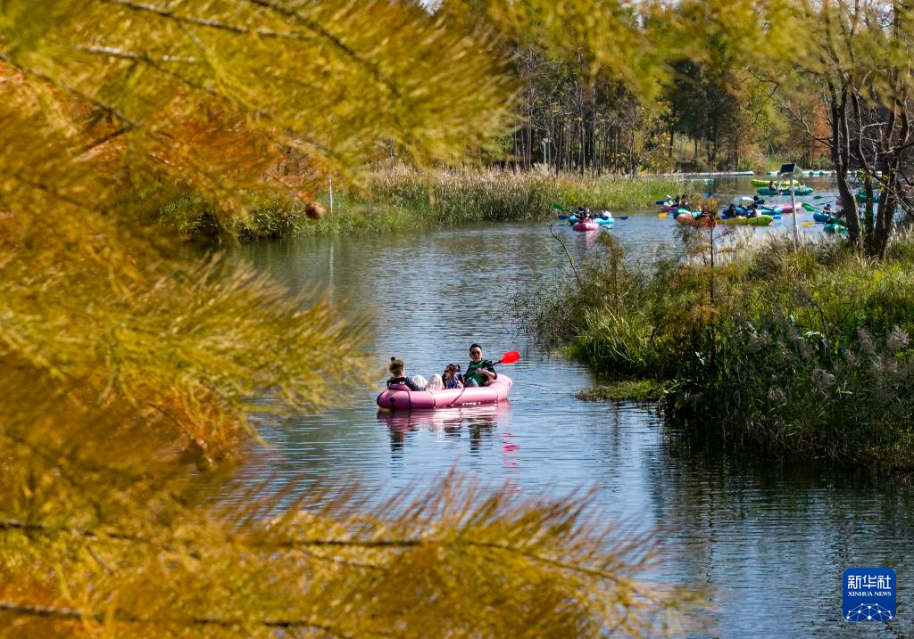 11月30日,游客在浙江省宁波植物园水杉林中挥桨戏水(无人机照片)。新华社发(胡学军摄)