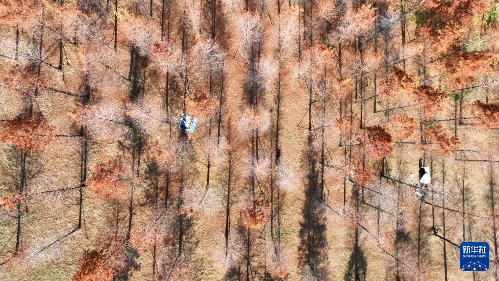 11月30日,游客在贵州省遵义市播州区播雅湿地公园水杉林游玩(无人机照片)。新华社发(李仁军摄)