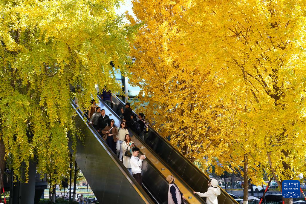11月30日,人们在浙江省杭州市环城北路一处位于银杏间的自动扶梯上打卡拍照。新华社发(庄颖昶摄)