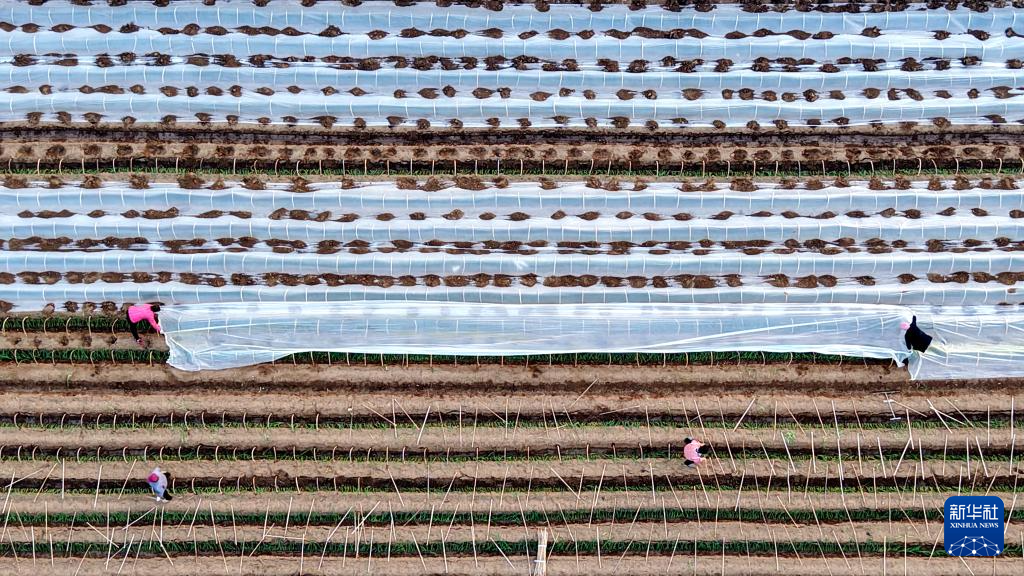 12月11日,在山东省临沂市平邑县地方镇,村民为种植的蔬菜幼苗覆盖保温薄膜(无人机照片)。新华社发(武纪全摄)